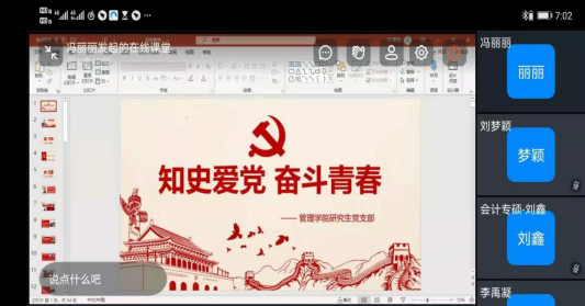 研究生党支部以“知史爱党,奋斗青春”为主题,利用钉钉会议在线上举办党史学习教育专题党课,并邀请做爱视频