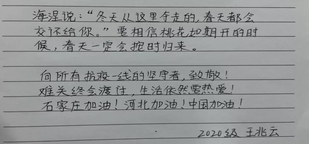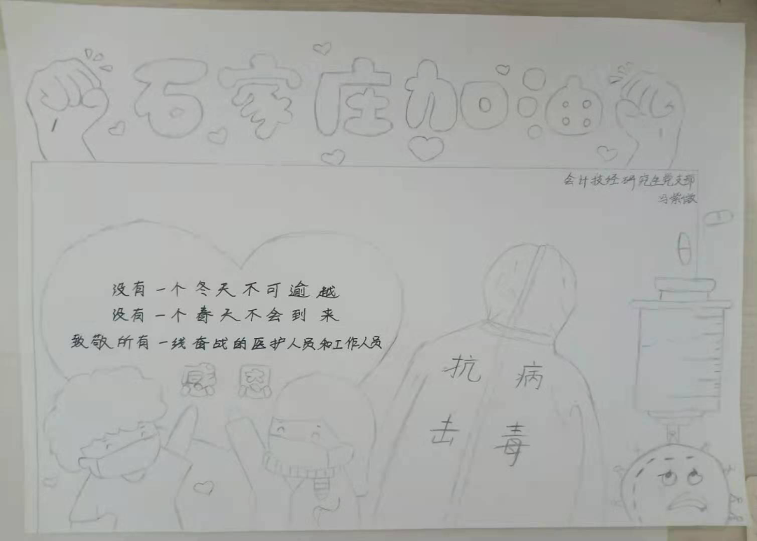 会计、技经党支部部分学生党员在自己的家乡加入到志愿者队伍中去,其他党员通过自己力所能及的方式为石家庄、邢台人民送上自己的祝福,盼望疫情早日消散,人们过上美好的生活。