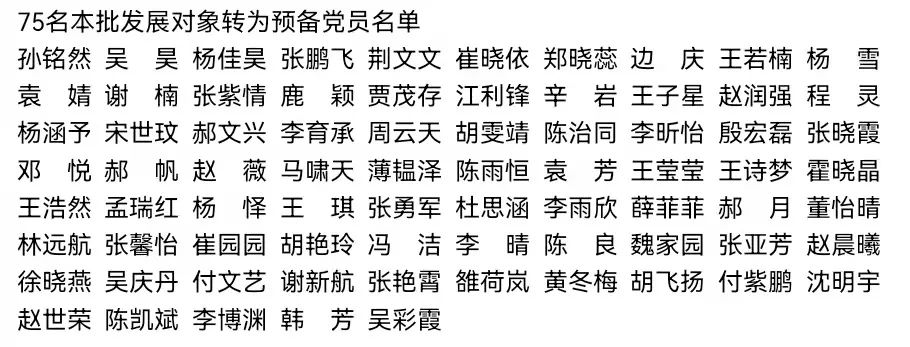 会议第四项,由正式党员进行不记名投票表决,经支部正式党员表决一致通过了孙铭然、吴昊、杨佳昊等75名同志发展预备党员的申请。