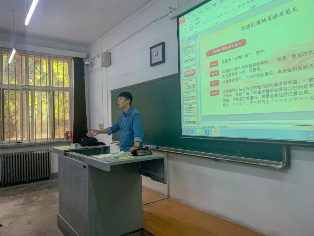 周峰老师以《坚持自我完善,争做合格党员》为主题,向大家介绍了申请入党的基本条件、党员的基本要求以及发展党员的基本程序。他还强调,端正入党动机是争取做一名合格党员的起点,并激励同学以实际行动争取早日入党。周峰老师又在最后的《常用入党文书写作与范文》专题中,为大家详细讲解了包括入党申请书、思想汇报、入党自传、入党志愿书、转正申请书在内的文书写法与范文。最后,周峰老师和大家分享入党誓词的内涵和深意,希望大家付诸实践,早日成为正式党员。