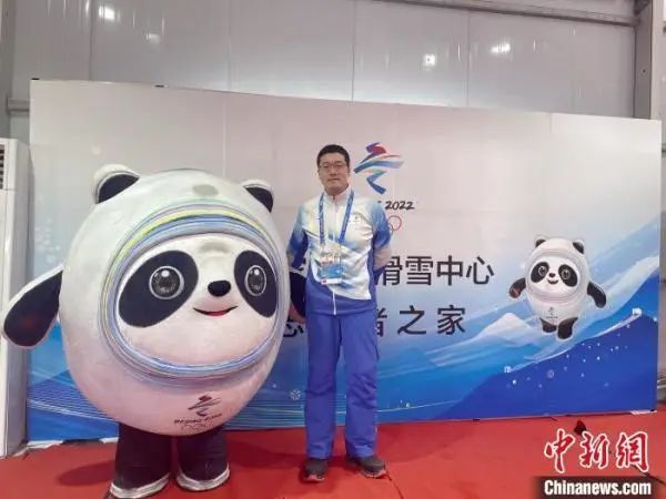 图为“双奥”志愿者贺玉德在志愿者之家与“冰墩墩”合影。 受访者供图
