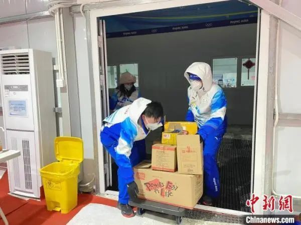 2022年2月20日上午,在国家越野滑雪中心,作为志愿者带队老师的贺玉德正在给志愿者们发放物资。