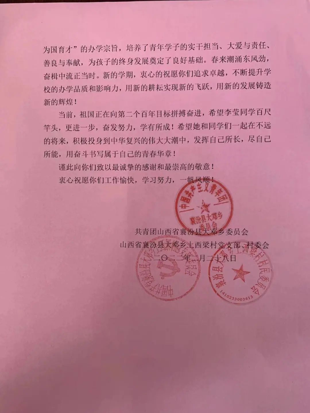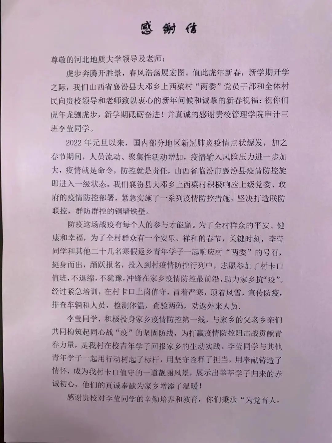 近日,学院收到了学生所在基层组织的感谢信: