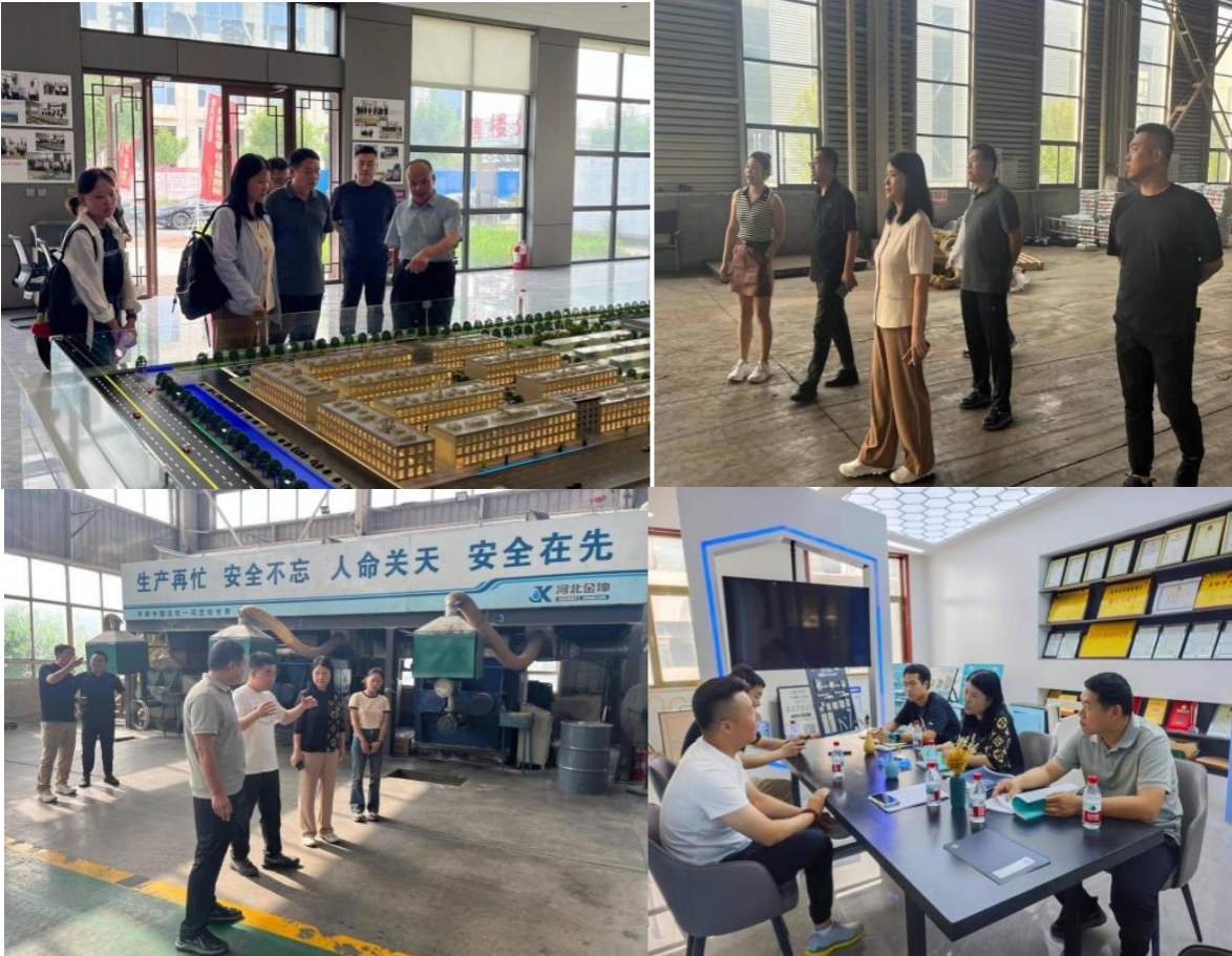 调研期间,团队实地考察了“门窗博览城”项目建设现场,并走进河北鑫良模架科技有限公司、河北京奥玻璃制品有限公司、河北金坤工程材料有限公司、河北龙正升金属门窗有限公司等重点企业。在生产车间,团队成员仔细察看建材生产加工全流程,围绕技术工艺、能耗管控、环保指标与企业负责人深入交流,并就市场拓展、转型升级、集群辐射、政策扶持、人才培养、校企合作等内容展开专题座谈。期间,团队向企业发放问卷,为后续研究奠定坚实基础。