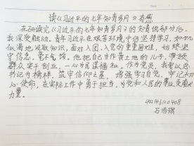研读《习近平的七年知青岁月》,我深刻感受到青年时代扎根实践、锤炼意志的重要性。对比我们当下,虽然身处校园,不再有黄土高原的艰苦,但同样面临学业压力、未来规划的挑战。书中习近平总书记在逆境中坚持读书思考的身影,启示我作为学生党员,更要珍惜学习时光,不浮躁,不躺平,培养“向下扎根”的精神,努力将书中汲取的力量转化为行动,从身边小事做起,在实践中行稳致远,用行动践行担当。