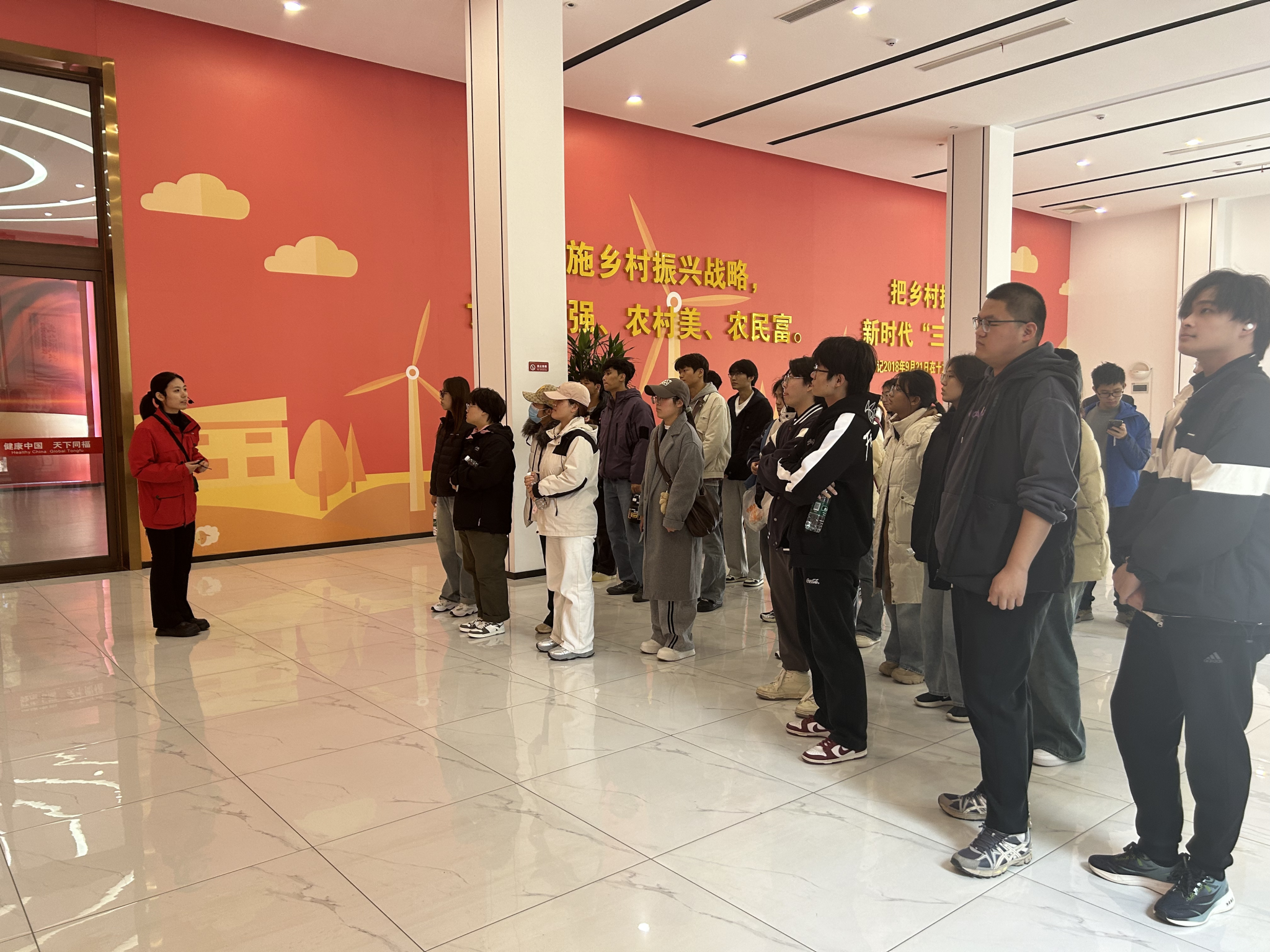 塔元庄村作为全国乡村振兴示范村,近年来以“农业产业化、养老市场化、旅游规范化”为发展主线,探索出“半城郊型”经济高质量发展路径。师生们首先参观了塔元庄同福乡村振兴模式展馆,通过展陈空间的实物展示、虚拟漫游等技术,系统了解该村与同福集团“村企银合作”的“六位一体”模式——以组织建设为保障、生态循环为基础、合作联盟为支撑、乡村文旅为纽带、田园康养为抓手、同福产业为核心,构建起一二三产深度融合的产业体系。