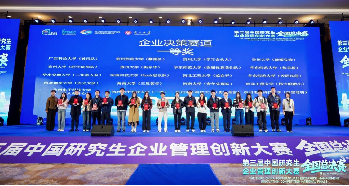 2025年11月7日-11月9日,由教育部学位管理与研究生教育司指导,中国学位与研究生教育学会、中国科协青少年科技中心、全国工商管理专业学位研究生教育指导委员会联合主办,贵州大学承办的第三届“中国研究生企业管理创新大赛”全国总决赛在贵阳圆满举行。大赛自2025年8月启动以来,共吸引全国321家研究生培养单位的4176支队伍,超18000名师生报名参赛,参赛规模创历史新高,来自全国150所高校的411支队伍晋级全国总决赛。