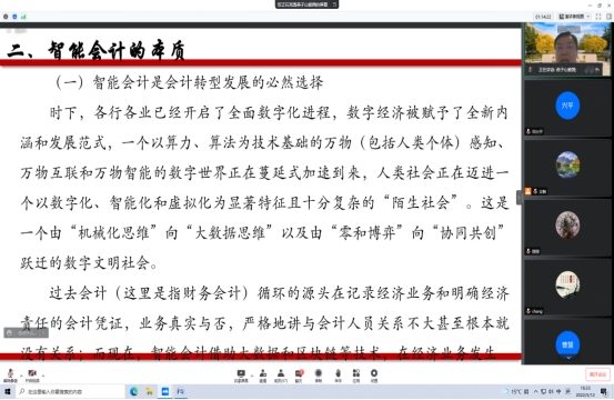 王爱国教授高屋建瓴,首先从国家战略层面分析了企业数字化转型和智能会计的重要意义和发展前景,接着从经典经济和管理理论出发阐释了数字企业的内涵及其在“大智移云”时代的作用机制。然后王教授重点对智能会计的本质作了详细的解析,他认为,智能会计是一项以数字经济为载体,以“业财融合”为基础,以财务共享为平台,以人工智能为支撑,在经济管理领域主要发挥大数据分析和辅助决策支持作用的人机共生、协同进化和管理赋能的管理活动;智能会计不仅是一项管理活动,还是一项数据治理主体参与、数据治理手段实施和数据治理机制协同的,带有全域性和生态性的会计治理活动。最后,王教授有理有据地阐释了智能会计的职能和科学性。