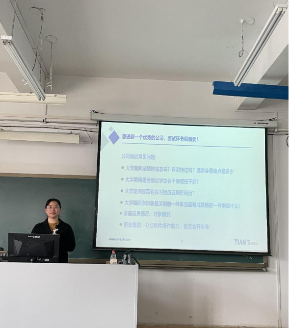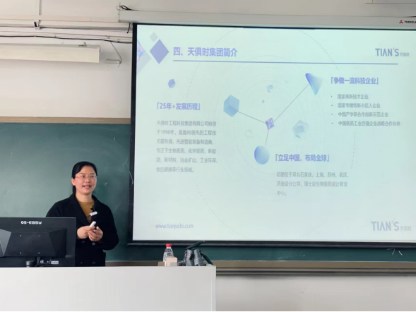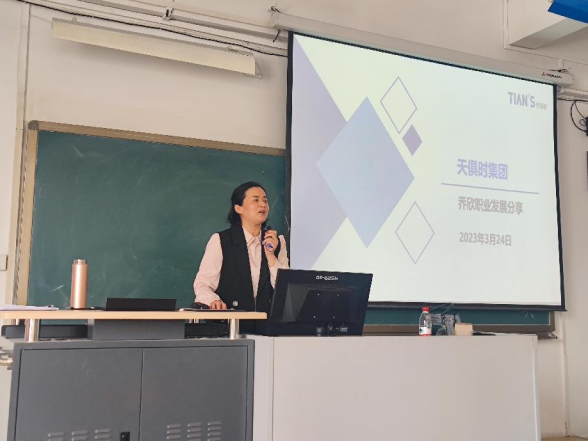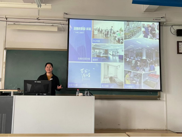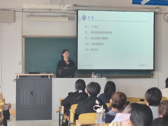 最后,乔欣就天俱时集团的企业概况、所涉行业、发展历程、资质优势、人才优势、工作环境及薪资福利等方面为同学们进行宣传介绍,同时向同学们介绍了天俱时校企开放活动,为大家提供了实习渠道。