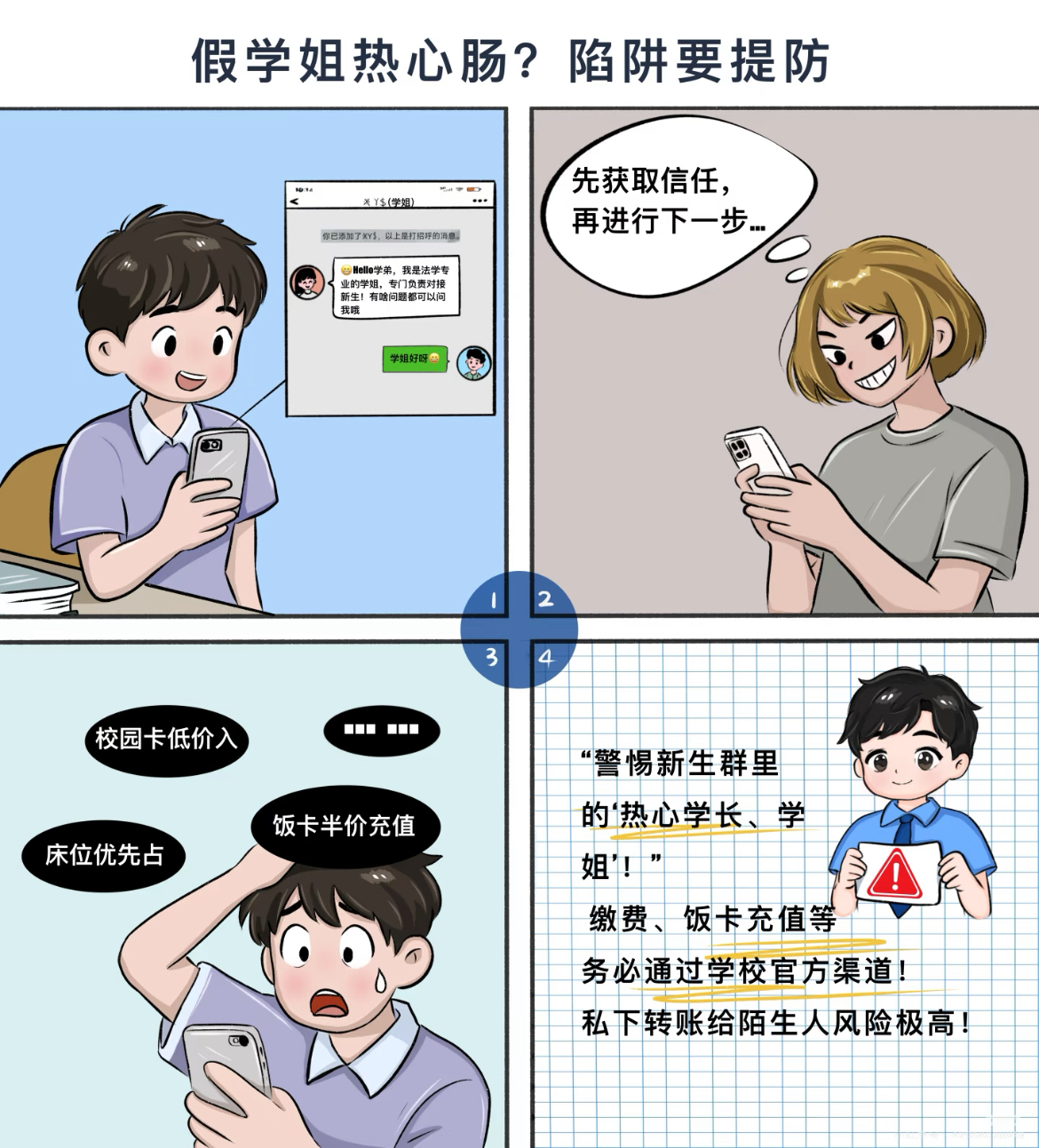 骗术:骗子冒充学长、老师或学校工作人员,创建“XX大学2025级新生群”,诱导新生加群后,以收取班费、资料费、押金等名义诈骗。