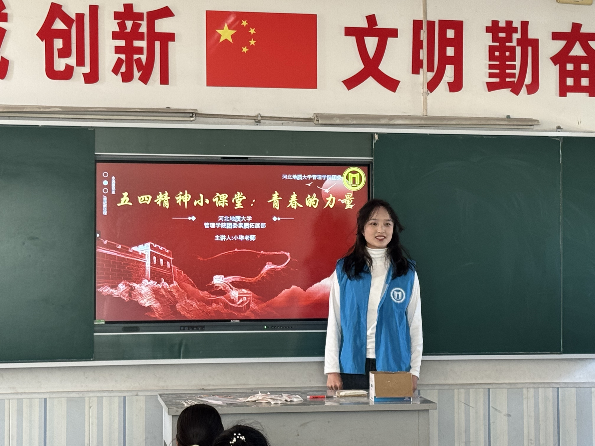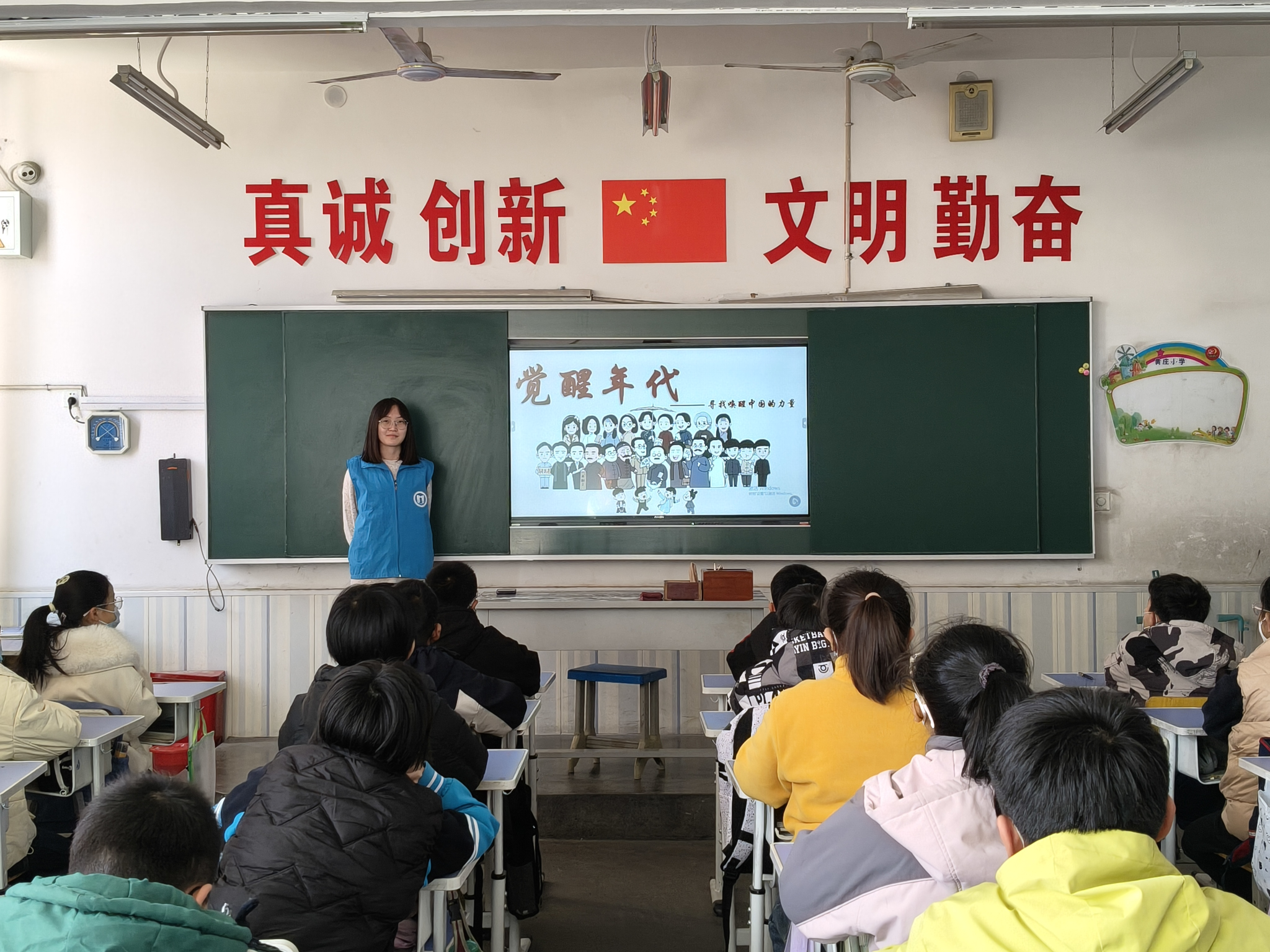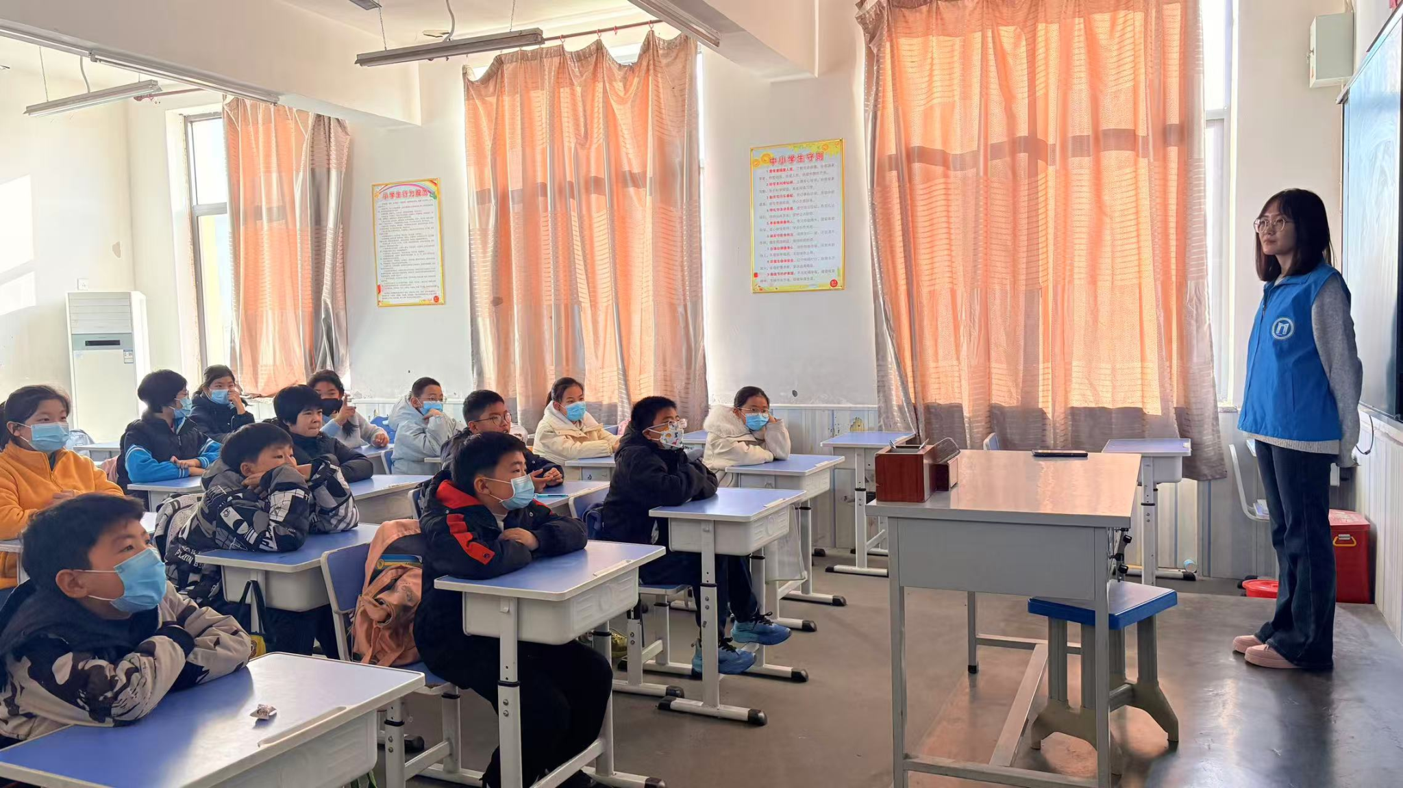 课堂开篇,志愿者通过视频播放和趣味提问,解答“五四运动是什么”:是近代中国青春力量的第一次觉醒,是反帝反封建的爱国浪潮。随后,开启“历史小故事”环节,聚焦“巴黎和会”。活动尾声,志愿者号召同学们把五四精神中的“青春热血”化为成长动力,以少年之姿,续爱国之光。